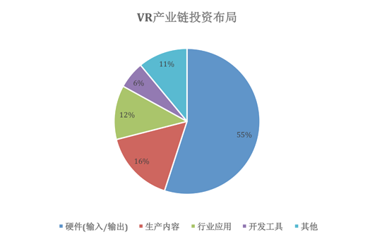 艾瑞上海互娱部在2016年3月发布的《2016年中国虚拟现实(VR)行业研究报告》显示,VR产业链(包括硬件(输入/输出)、生产内容、行业应用、开发工具等)的投资布局项目总计67个,生产内容为11个占其中16.4%,硬件(输入/输出)为37个占55.2%(如图)。