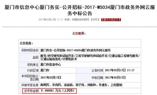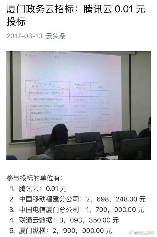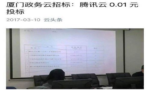2017年3月17,中国政府采购网发布《厦门市信息中心厦门务实-公开招标-2017-WS034厦门市政务外网云服务中标公告》,公告显示:腾讯云以0.01元成功中标。这个结果不出意外但仍超乎众人的一般认知理解,因而成为这周末热议的话题。