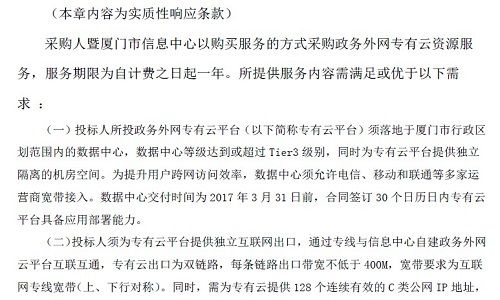 根据《招标文件附件一《厦门市政务外网云服务建设要求》,所需要的资源主机、存储等资源具有一定的通用性,这方面运营商和BAT为代表的互联网公司在集采价上的差异不会太大。就目前的云服务,真正能够拉开差距的软件层面的能力,这方面个人认为电信运营商是不如BAT公司的。因此,从这个角度来看,运营商的反思很关键。既一方面,腾讯云报价1分钱的这种打法的狡猾估计是其他各方始料未及的。但是,更关键的一点,随着运营商管道能力的下沉,对于云服务的能力,现在市场上总体上是出现不利于运营商的趋势的。云服务能力,阿里云、腾讯云、百度云、网易云、网速云等等这些的竞争能力、服务水平、响应能力都很值得运营商借鉴。因此,在狡猾的敌军面前,我军的无能也可能是迫使一些地方政府作出一些违规选择的一个原因。这实际上是给运营商也敲响了警钟,特别是在提速降费的政策背景下,ICT业务可能面临新的危机。