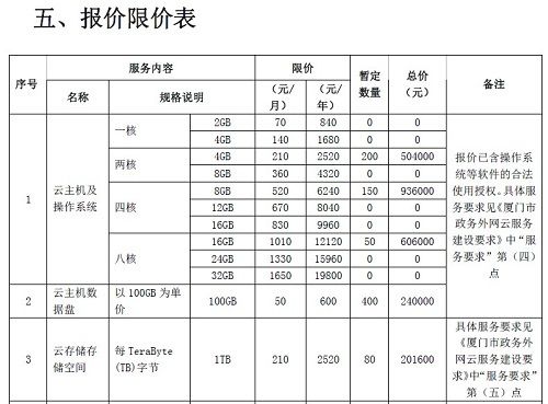 根据《招标文件-2017-WS034厦门市信息中心-厦门市政务外网云服务》和《招标文件附件一<厦门市政务外网云服务建设要求>》的两份文件,厦门市政务外网云服务于2017年2月17日发布对外招标公告,厦门市政府采购政务外网专有云资源服务,服务期限为自计费之日起一年。项目预算金额总价为495万元。根据附件一,报价限价表中前三项云主机及操作系统、云主机数据盘及云存储空间三项的预算限价就达248.76万元。