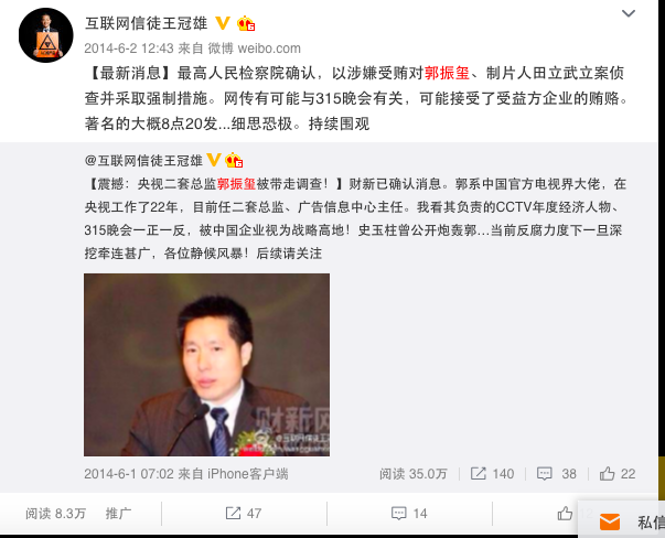 最著名的关联事件,当属前央视财经频道(二套现在的正式名称)总监郭振玺被带走调查。郭系中国官方电视界大佬,在央视工作了22年,被带走前任CCTV二套总监、广告信息中心主任。后经最高人民检察院确认,以涉嫌受贿对郭振玺、制片人田立武立案侦查并采取强制措施。我曾吐槽,郭负责的CCTV年度经济人物、315晚会一正一反,被中国企业视为战略高地!该评论被各家媒体多次引用,也说明了某种舆论。