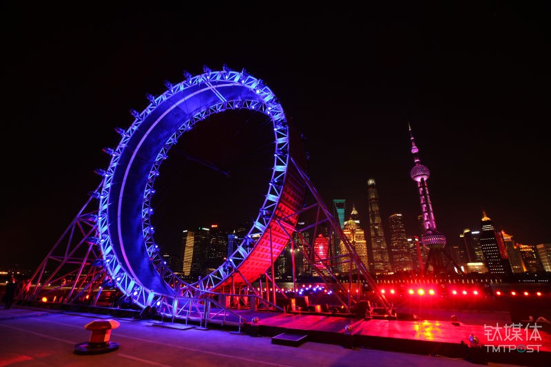 与东方明珠一江之隔的空地上,竖起了一座高达20米的摩天轮,由英国传奇车手特里·格兰特(Terry Grant)驾驶的F-PACE从摩天轮左侧呼啸而来,箭一般窜上空中跑道,绕摩天轮一周后,在人群欢呼中顺利落地。
