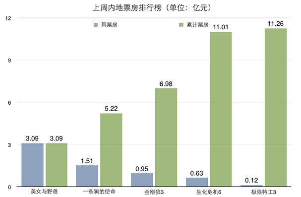 值得一提的是, 《美女与野兽》在内地同样以首周3.09亿的成绩轻松拿下上周内地票房冠军。