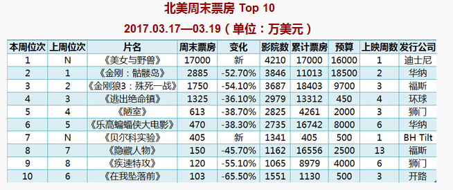 近日,作为迪士尼今年的首部重磅作品,《美女与野兽》于3月17日在北美上映,首日票房就报收6378.7万美元,在经历周末两天后,影片的北美票房达到了1.7亿美元,创造了北美市场春季档的全新开画票房纪录!