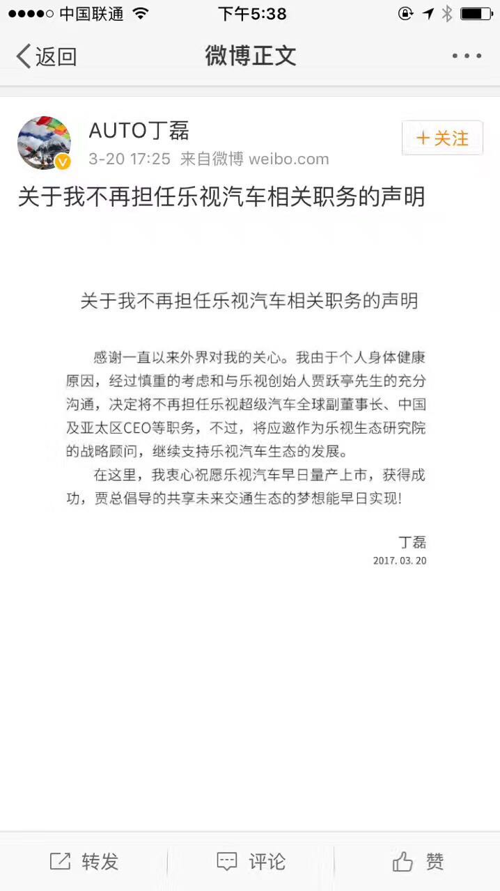 钛媒体快讯|3月20日消息,乐视汽车全球副董事长丁磊通过微博宣布,由于“身体健康原因”不再担任副董事长、中国及亚太区 CEO 等职务。