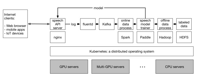 通用集群数据还是存储在HDFS上,在HDFS上有一些有标签的数据,这些数据送给PaddlePaddle做线下训练。在这个系统的前端就是一个语音识别的服务,用户去提交自己的语音后返回一段文字。在这个前端语音识别API里用户实时提交的语音数据就形成了一个实时的日志,这个日志就会被其他的进程收集下来,比如使用Kalfka进行收集,再去做一些线上的预处理,进而将这些数据继续传递给PaddlePaddle做训练。这样PaddlePaddle既可以支持线下的大批量的数据训练,也可以支持线上的实时的数据训练。