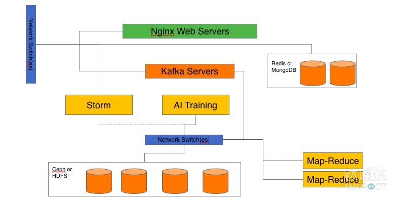 专用集群其实是更常见的一种集群配置模式。比如说我们公司有存储的需求,我就配置一个Hadoop集群去使用HDFS,有线下处理的需求,我再用Hadoop的Map-Reduce集群去做线下处理。对于网站的话,网站前端大家会配置一个nginx集群,再使用kalfka将网站的一些日志收集下来,再给AI处理。