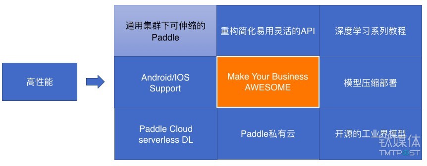 PaddlePaddle开源了以后,和作为百度内部的一个项目有非常大的差别,我们从原来只追求高性能和功能,渐渐的要过渡到下图所示的几个目标。我们所有的事情只有一个最重要的点,也就是中间的那个橘色的方块,我们希望让大家的业务变得awesome,变得非常炫,非常给力。我们评价PaddlePaddle“给力”的标准不是发了多少论文、被多少媒体提及,而是解决用户痛点,让用户爽。