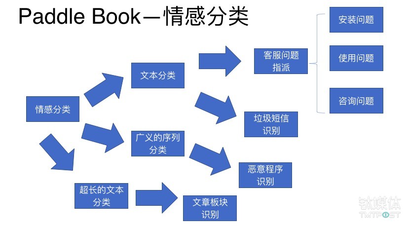 每一个例子都是精心设计过的,比如说其中的一章情感分类。所谓情感分类就是将一个文本分类成正向情感还是负向情感,实际上就是一个简单的文本分类问题。单纯套用文本分类的模型,我们可以去解决如下图所列各种各样的问题。