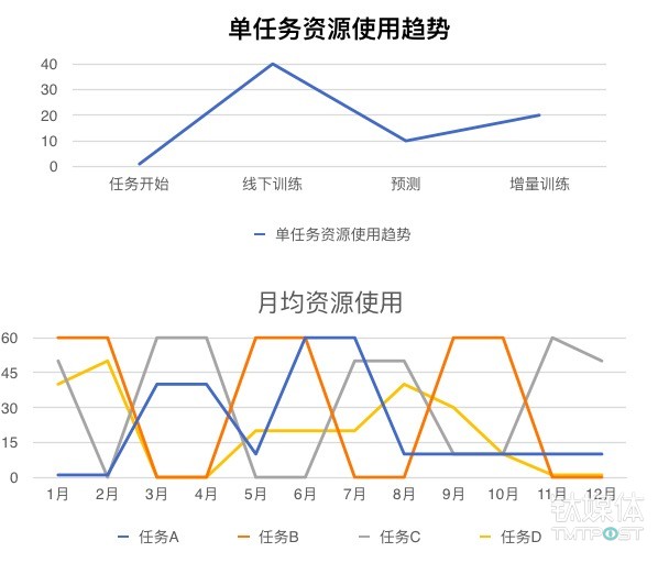 可以看到一个初创企业如果只有少数的几个深度学习任务,由于深度学习任务的周期性,专用的深度学习集群一定不会有非常高的使用率,大体上能有20%的使用率就已经很不错了。但像在百度、谷歌之类的大公司,有各种各样的产品线,这些产品线都需要使用深度学习进行一些提升,所以这些任务虽然有周期性,但是任务和任务之间发生的时间是不同的,所以就形成了各个任务之间的一个叠加效应。