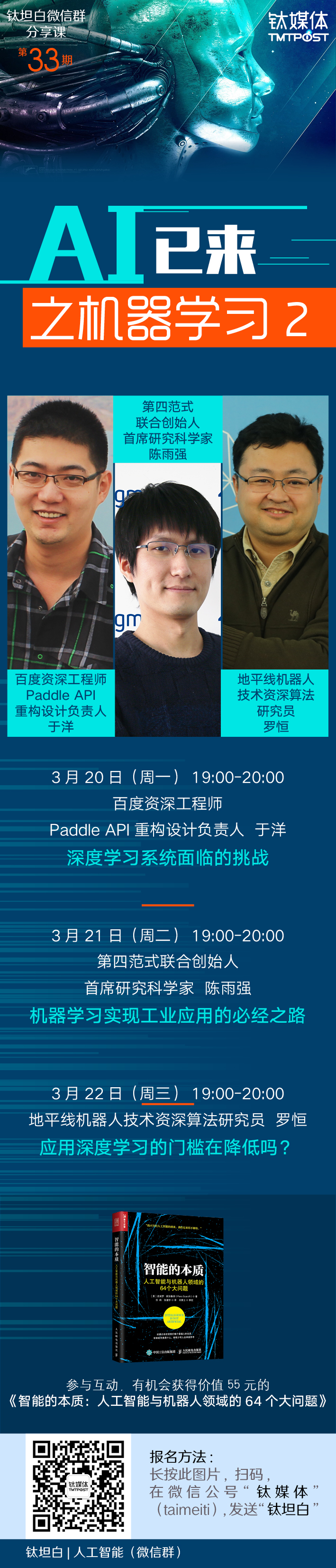 在钛媒体Pro专业用户和付费用户专享的“钛坦白”在线课堂第33期,我们再次请来三位钛客分享对机器学习的思考 。本期钛客之一、百度资深工程师、Paddle API重构设计负责人于洋,从事百度深度学习平台PaddlePaddle开发工作。加入百度后一直从事深度学习系统的研发,主要负责深度学习系统的性能优化和功能开发工作。2016年获得百度年轻高潜人才(YTP)项目成员以及百度最佳个人。