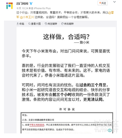出门问问方面拒绝签署该条款,表示并不认可。然而在小米的发布会上,小米方面还是用问问的语音SDK照常展示了语音交互。并且临时下架了感谢出门问问的PPT页。
