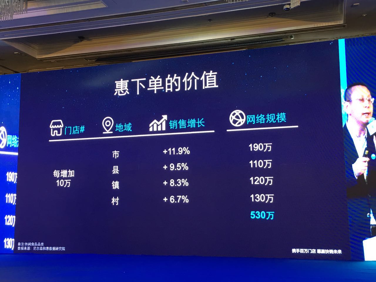 “有规模才有价值。”崔震对钛媒体记者表示,“当你有500万门店、300万门店,和你有3万、5万门店甚至30万门店,这个差距是巨大的。”而根据惠下单提供的数据,每增加 20%的门店覆盖,物流和管理成本下降 0.7%,品牌业务代表拜访门店的平均效率提高 11%。