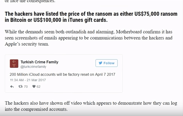 黑客向苹果勒索的赎金是7.5万美元的比特币或是以太坊(Ethereum,一种越来越流行的加密数字货币),或是10万美元的iTunes礼品卡。该黑客组织已接触多个媒体,企图向苹果施加压力。