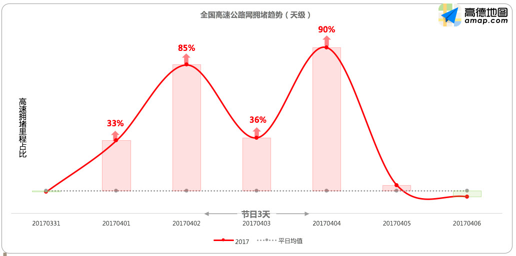 报告显示,清明节假期全国高速免费通行,且全国多数群众会集中踏青出游、扫墓出行,预计从小长假前一天(4月1日)开始,全国高速将出现拥堵上涨的情况。节日三天全国高速拥堵将总体呈“M”型趋势,拥堵较平日均值高85%、36%和90%,4月4日全国高速将迎来拥堵最高峰。