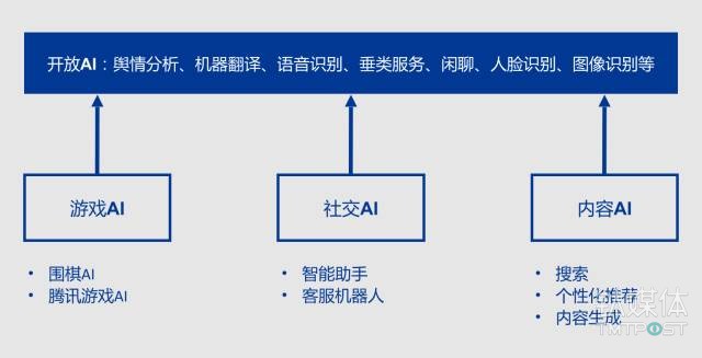 同时发展AI在具有腾讯特色的四大业务场景中的应用能力:内容 AI、社交AI、游戏AI和平台工具AI。