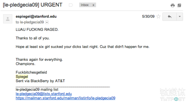 五月底,一批斯皮格在大学期间的邮件曝光,他在信中的语气轻佻,并且使用了大量和性有关的侮辱性词汇来开女性的玩笑,这些信件引起了轩然大波。最终,斯皮格不得不出面道歉来平息众怒,他在公开信声称自己“对在兄弟会的日子被曝光感到异常羞愧……我很抱歉自己过去写了那些东西,写下那些的我就是个混蛋”。