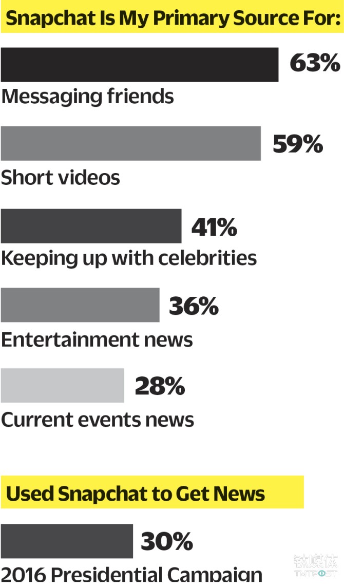 数据显示,59%的用户将 Snapchat 当做他们看视频的首选,这一选择比重仅次于和朋友收发信息(63%)。
