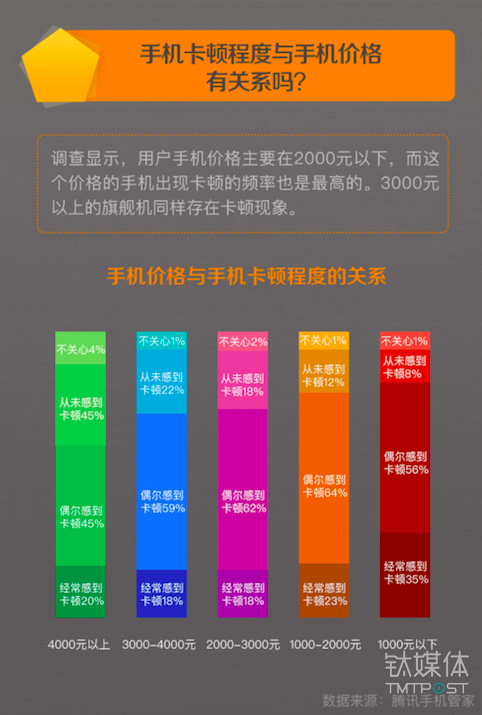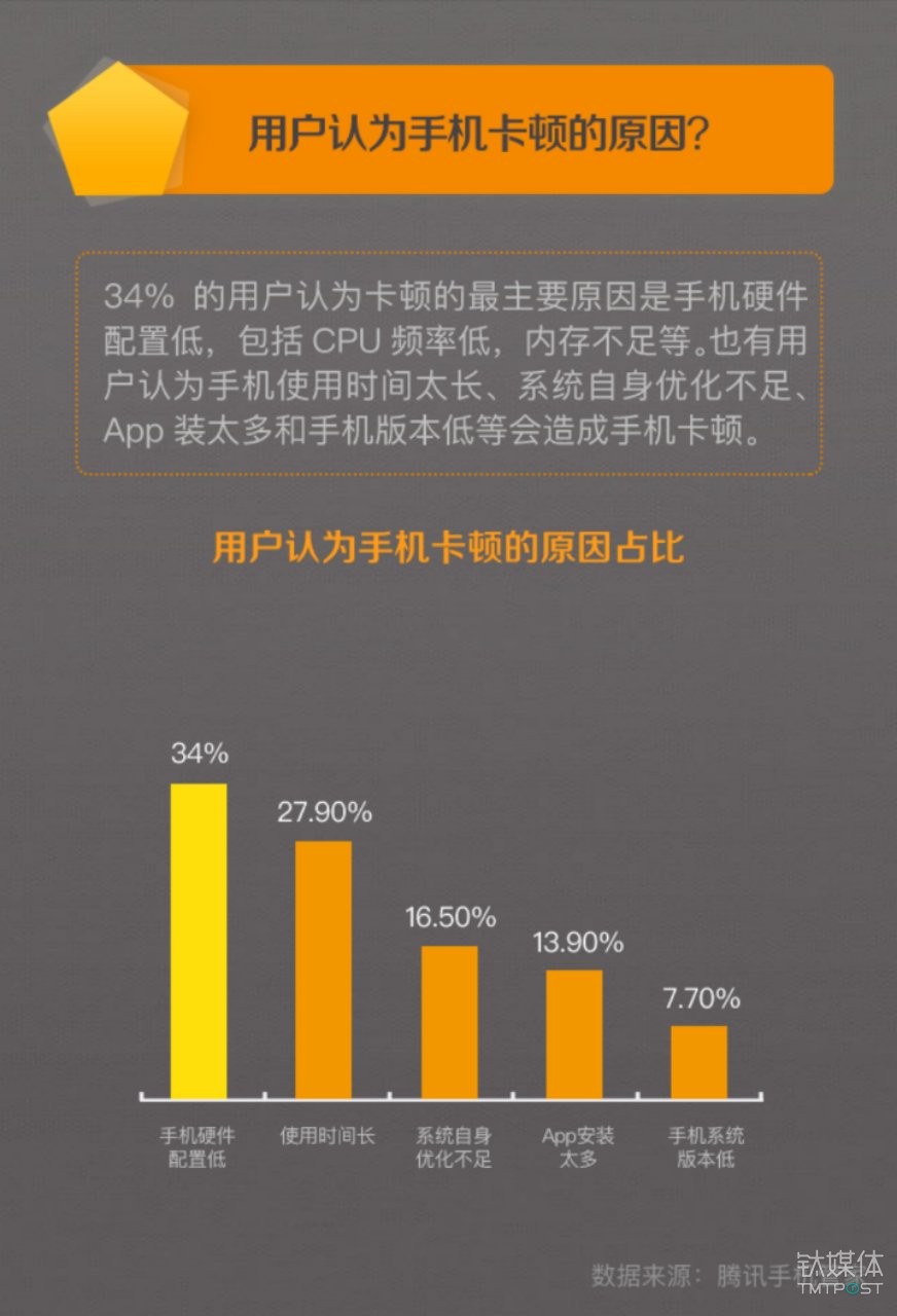 上述报告中,有34%的用户认为卡顿的最主要原因是手机硬件配置低,这其中包括CPU频率低,内存不足等。此外认为是手机系统的原因的用户也占到了24.2%。