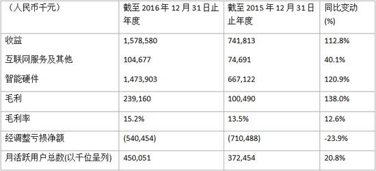在智能硬件分部方面,收益达到人民币14.739亿元,较2015年增长120.9%,主要由平均售价及销量增长所驱动。