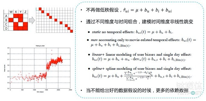 第二点,可以通过不同维度的时间组合来建模时间维度的非线性跳变。作者也在论文写到,他发现有些电影的打分并不是线性的,有时会出现一些不可解释不可描述的跳变,这些跳变其实很难通过某种固定的方式进行建模。所以他提出了下面好几种建模的方式,比如说把时间进行分统,跟每个物品Item进行组合,跟每个用户进行组合,包括分统了以后进行分段组合,这种方式都是不再对具体的时序特点进行建模,而是把他变成一个参数统一的由数据进行拟合。这个地方你也可以看出来,当我们的研究人员不能给出比较好的模型假设的时候,我们又不知道如何去应对突变的时候,我们可以更多的去依赖于数据,用潜在的参数建模可能性,然后通过数据学到这些参数应该对应的权重,然后进行建模。