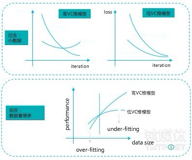 当然这只是故事的一半,随着时代的不断的发展,我们会发现数据会越来越多,如果我们把横轴替换成数据这个维度,如下方这幅图,在数据比较小的时候,低VC维的模型比高VC维的模型效果好,因为高VC维的模型会over-fitting,但是随着数据越来越多,高VC维的效果会不断提升,而低VC维系统会达到一个上阶,这就是所谓的under-fitting的问题。当然这只是故事的一半,随着时代的不断的发展,我们会发现数据会越来越多,如果我们把横轴替换成数据这个维度,数据从小到大这么一个过程,我们会发现,下方这幅图就是有两条曲线。其中第一条曲线是说,过去的曲线是这条over-fitting的曲线,在数据比较小的时候,我们低VC维的模型比高VC维的模型效果好,因为高VC维的模型会over-fitting,但是随着数据越来越多的时候,高VC维的效果会不断提升,而低VC维系统会达到一个上阶,这就是所谓的under-fitting的问题。