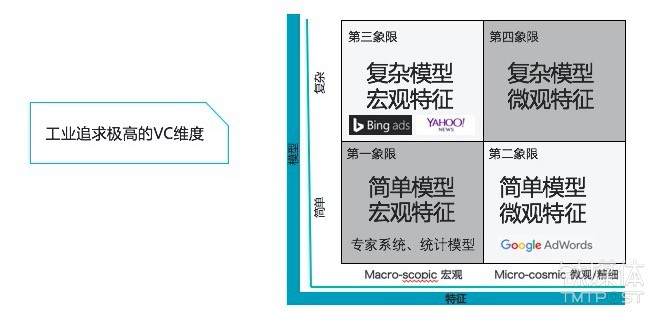第二象限是简单模型加上复杂特征,这里面最成功的案例可能就是谷歌的Adwords。谷歌的Adwords里面有上千亿的特征,取得了非常大的成功,给谷歌带来了很多的收益,现在占据了谷歌70%以上的收入。同时谷歌的展示广告也使用了同样的技术,并且占据剩下20%的收入。这样的模型现在不仅是在谷歌,在整个互联网广告中都是被使用的最广泛的一个技术。