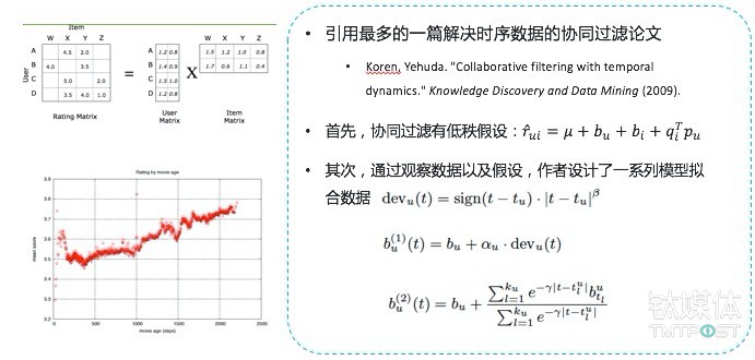 靠下位置作者给出的图,是作者发现的打分的问题,比如MDB电影的打分会随着时间的推移而不断地上升,所以他设计了一系列的线性模型来拟合这样的趋势。他会设计一个User打分的时间,第一次打分的时间的偏置乘一个斜率是他打分的偏置,同时他会对每一个电影设计这样的打分的偏置,考虑到每个Item随着时间的影响受到的打分的波动。