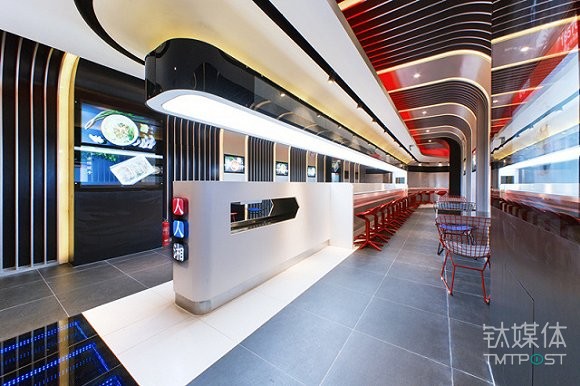 “人人湘”主打的“无人餐厅”内部场景,餐厅里布置了用作点餐、支付的 LED 平台以及传送餐具的传送带。