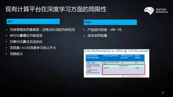 由于FPGA的计算构架可以全定制,所以它在很大程度上克服了GPU的弱点。但FPGA也有问题,产品本身迭代比较慢,四年才会产生新一代的产品,所以它也无法满足一个自动驾驶高速演进的需求;另外,就是当你对于门阵列和internal memory的需求比较大时,它的成本也会变得比较高。
