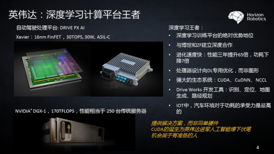 英伟达则是在深度学习领域和训练平台这块占有绝对的优势。李星宇解释道,英伟达和博世的结盟以及与德国采埃孚集团(简称:ZF,ZF与英伟达计划2018年推出人工智能自动驾驶系统——ProAI)建立的深度合作,使得它在汽车领域获得一个很好的基础。