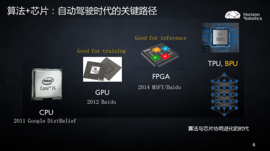 回顾过去自动驾驶所使用的计算平台,可以看到由最开始使用CPU,到后来的GPU,到现在GPU和FPGA的组合使用。在未来的话,其实是一个基于专用的人工智能IP的处理器时代,在这样一个时代最显著的特征就是算法和芯片要协同进化。
