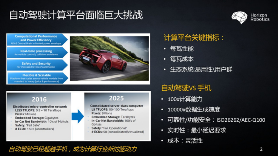 第一,自动驾驶对计算能力的要求非常高。相对于手机可以看到的计算需求,自动驾驶大概要超过两个数量级(100X),数据生成速度方面超过四个数量级(10000X),这是非常恐怖的;