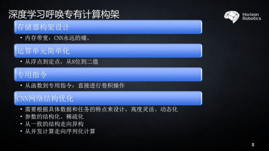 一方面是克服现有的计算平台在深度学习计算方面的不足,比如存储器构架的设计。在计算单元的设置方面要有高度的灵活性。比如原来的CNN (卷积神经网络)可能是浮点的操作,现在为了减少对计算资源的需求,从浮点转到定点是一个趋势。