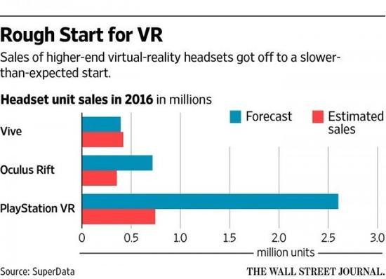 上个月,索尼官方对外公布了旗下 VR 产品 PlayStation VR 的销量:上市 4 个月时间,全球卖出超过 91.5 万台。PS VR 的同类产品 HTC 与 Oculus 都没有正式对外公布过销量,但根据数据分析机构 SuperData 的报告,2016 年 HTC Vive 销量为 42 万,Oculus Rift 销量为 24 万,加起来还不如 PS VR 卖的多——当然,数据只能作为参考,SuperData 还曾预计 PS VR 2016 年销量将达 260.2 万台,这与索尼官方公布的数据相去甚远。