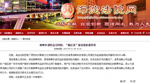 今日,海淀法院通报了杭州麦果文化传媒有限公司起诉北京卓易讯畅科技有限公司侵犯作品信息网络传播权一案,原告诉称被告公司运营的“豌豆荚”未经授权传播韩寒作品。而原告果麦公司起诉时称,自己经韩寒授权,才享有韩寒多部作品的信息网络传播权。