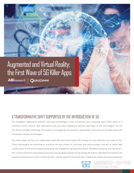而为了所有这一切工作的顺利进行则需要5G网络的支持。市场研究机构ABI Research联合高通曾发布了白皮书《AR/VR:5G杀手级应用的第一波浪潮》(《AugmentedandVirtualReality:TheFirstWaveof5GKillerApps》)指出: