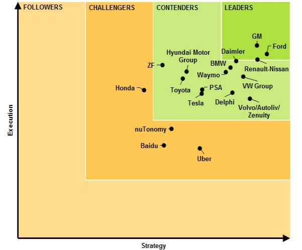 至于自动驾驶,就在特斯拉市值超越通用汽车不久前,一份来自Navigant Research的自动驾驶研究报告为 18 汽车厂商、供应商和技术公司进行了一次综合排名。其中,传统汽车厂商取得了绝对领先的优势。其中福特和通用分别排在第一和第二,特斯拉甚至根本没有进入前10榜单中。而在由领导者(Leader)、竞争者(Contender)、挑战者(Challenger)和跟随者(Follower)构成的自动驾驶竞争格局象限中,也仅是挑战者的角色。