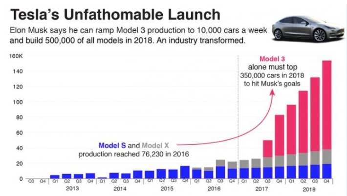 而具体到此次特斯拉市值超越传统汽车厂商通用汽车,主要是受到特斯拉今年第一季度其交付新车数量创造了特斯拉新的季度销售纪录和中国互联网巨头腾讯控股出人意料地以18亿美元入股特斯拉,让饱受资金短缺困扰(也是最影响特斯拉股价)的特斯拉有了喘息之机,还有一个因素是跟特斯拉旗下航空航天公司SpaceX有关,最后就是马斯克承诺其包括Model3在内的汽车产量将在2018年底实现50万辆的目标。