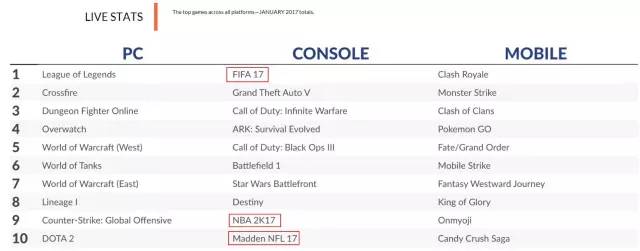从市场调研机构Superdata提供的数据可以发现,截止2017年1月,FIFA17是全世界最受欢迎的主机游戏,其中NBA2K17和NFL17也位列前十,由此可见,在主机领域,体育模拟类游戏仍然有着不容忽视的地位,然而在中国,上述的三款游戏在政策上并未真正入华。