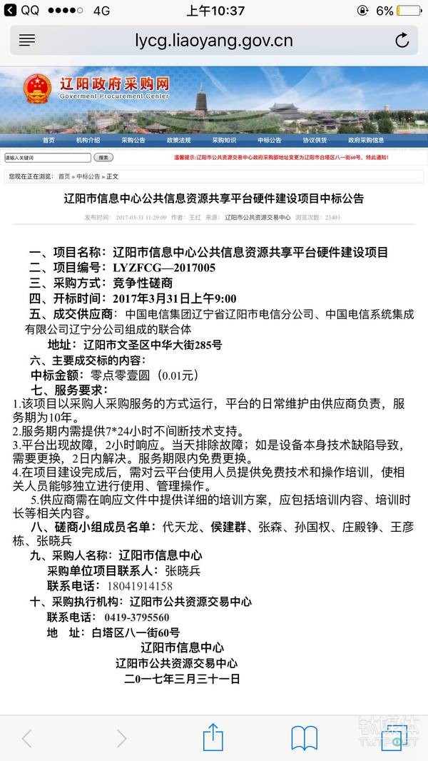 根据3月31日辽阳政府采购网登出了“辽阳市信息中心公共信息资源共享平台硬件建设项目中标公告”显示,辽宁市的这个硬件建设项目由中国电信集团辽宁省辽阳市电信分公司、中国电信系统集成有限公司辽宁分公司组成的联合体,以0.01元的中标金额拿下了。