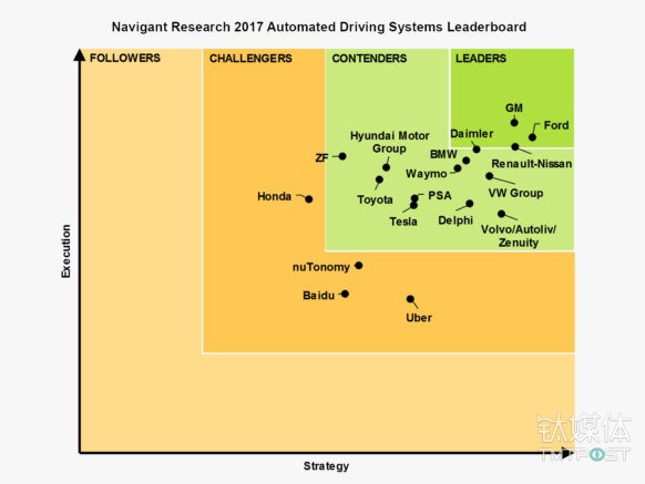 出人意料的是,百度和Uber并没有如预期一样排在前面,甚至没有进入第二梯队,他们属于自动驾驶领域的“挑战者”。