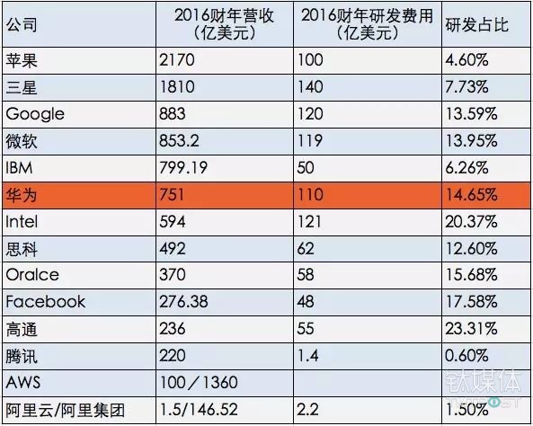 在上述6家研发投入超过百亿美元的企业中,华为的研发投入排在第5位、营收排在第5位、研发占营收的比例排在第2位。