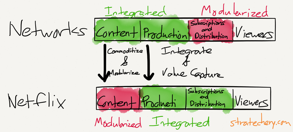 (分包化内容生产者:传统电视公司的内容和制片是整合在一起做的,而订阅和渠道则是分包的。Netfilix将内容生产部分分发交给内容提供者们,而它自己则整合了产业链后面的制片、订阅和渠道等。)