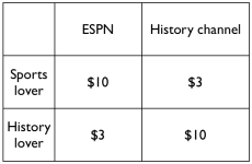 “有线电视公司应该报价多少才能把收益最大化呢?注意最优价格总是稍微低于消费者的“意愿价格”的,不然消费者就无法从购买中获利。简单起见,假设销售价格是“意愿价格”的90%。如果ESPN与和History Channel 频道是分开独立销售的,营收最大化的定价就是9美元( 10美元的90%)。体育迷订购ESPN,而历史迷订购History Channel。有线电视公司将获得18美元的营收。”