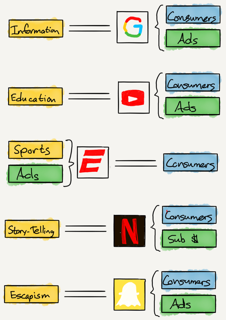 逃离现实和看故事的功能从传统电视里被慢慢被剥离的现象,是值得注意的。更重要的是,这两件事是在同一时间发生的。电视曾为观众提供的功能重构时的景象,可能会如下图所示: