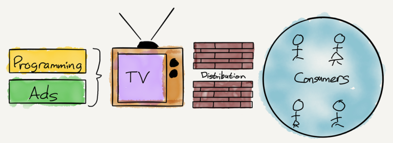 无线电视:无线电视和印刷业的模式相似,控制了渠道的部分(通过广播经营许可证),就可以把电视节目和广告结合起来。