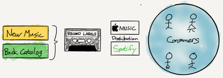 请注意,在这个体系下,Spotify和苹果对整个音乐行业的控制力都是非常小的,从纯经济学的角度来看,两者都没有足够大的用户基数来完全控制内容生产者(那些音乐人),同时他们也都没有那些老唱片集的版权(因此不能据此售卖新歌)。