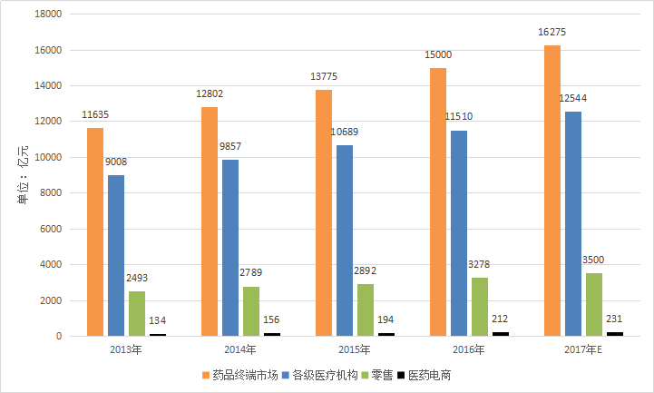 从以上数据大概也能看出药品渠道结构,即各级医疗机构和零售渠道销售占比为8:2左右,医药电商作为新兴渠道,占总体市场规模不到2%。