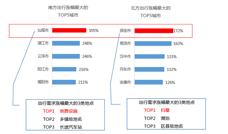 全国来看,清明期间南方出行更活跃,用户出行关注热度明显高于北方;南方汕尾市增幅最高,达305%、北方保定市用户出行关注热度增幅最高,达172%。其中,南方城市增长70%,北方城市增长51%,其中南方出行涨幅最大的TOP5城市均位于广东省,北方排名第一的为河北省保定市。